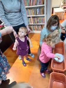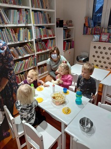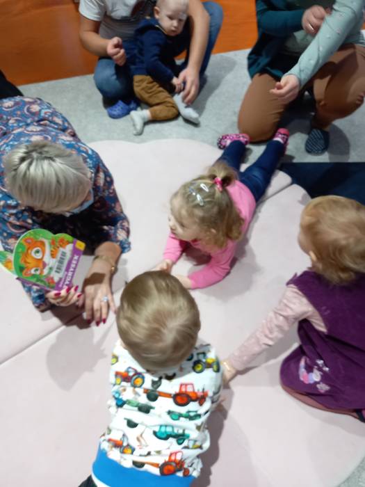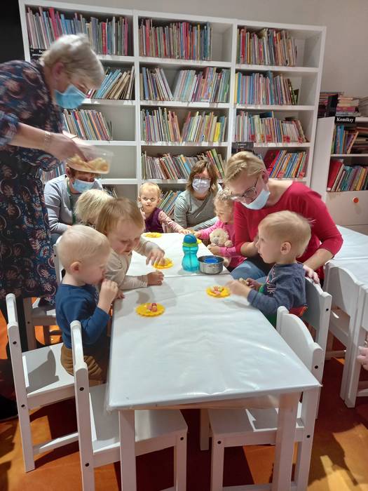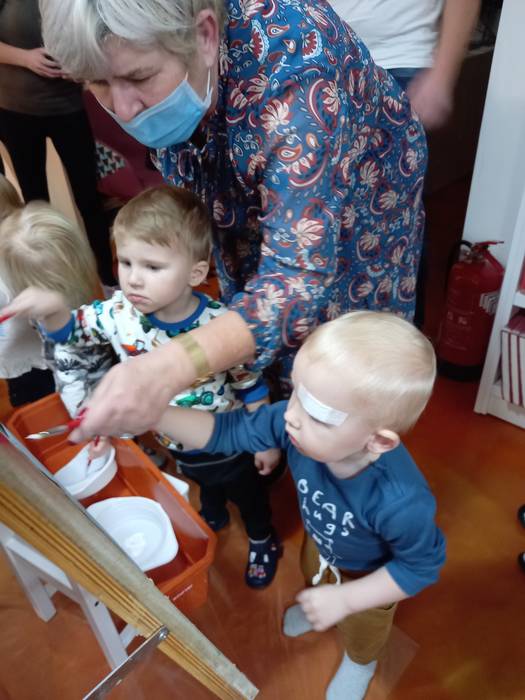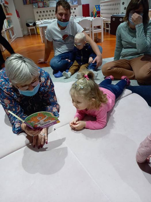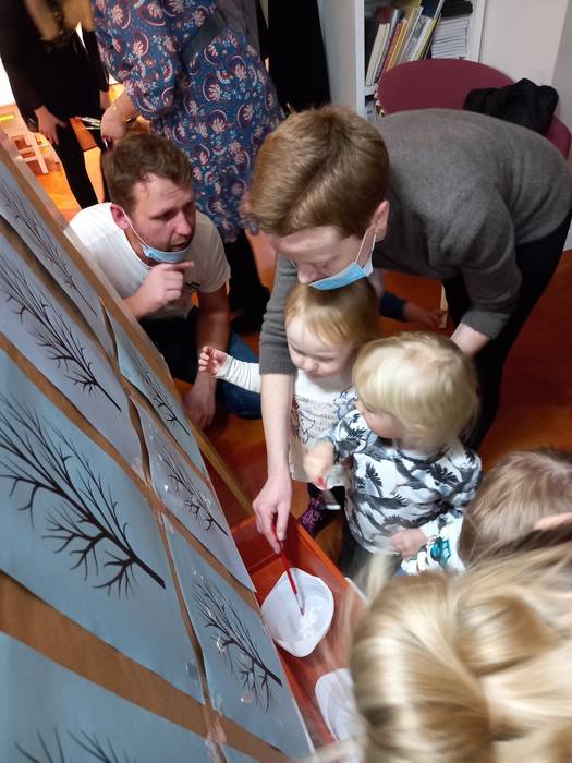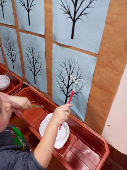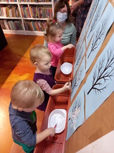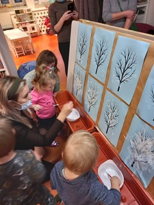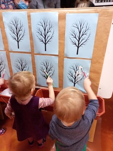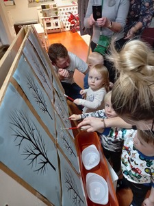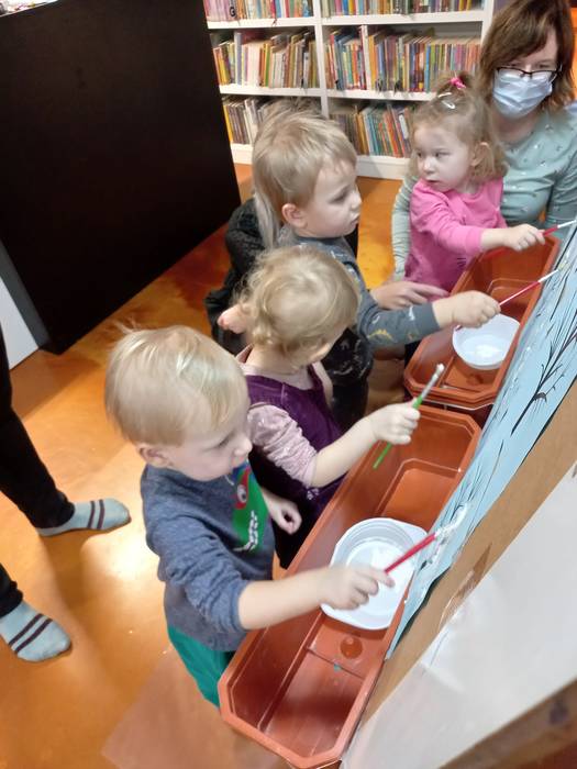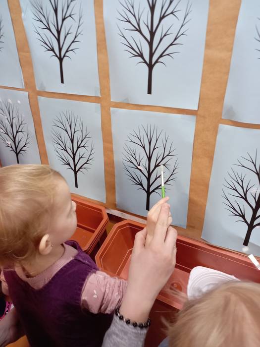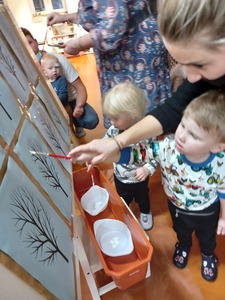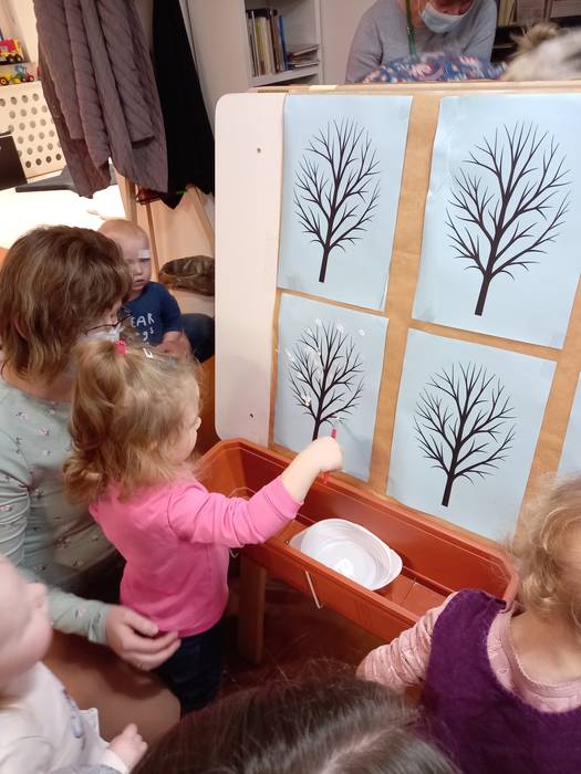 Podczas wczorajszych zajęć maluchy, oprócz tradycyjnych zabaw muzyczno-ruchowych dekorowały białą farbą zimowe drzewka. Dodatkowym elementem zajęć było czytanie bajek na dywanie.