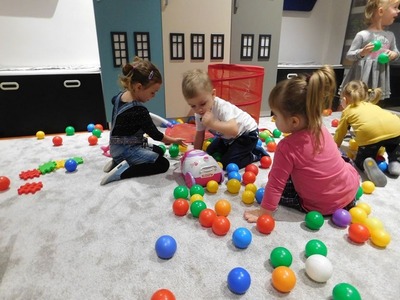 Podczas wczorajszych zajęć wprowadzono nowy element - zabawy przy muzyce z użyciem kolorowych chusteczek. Później, z okazji walentynek, dzieci wyklejały serduszka kuleczkami z czerwonej krepy, ćwicząc w ten sposób zdolności manualne.
