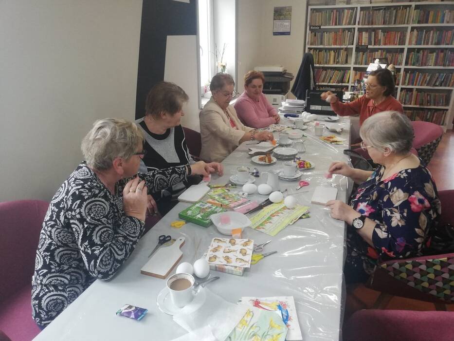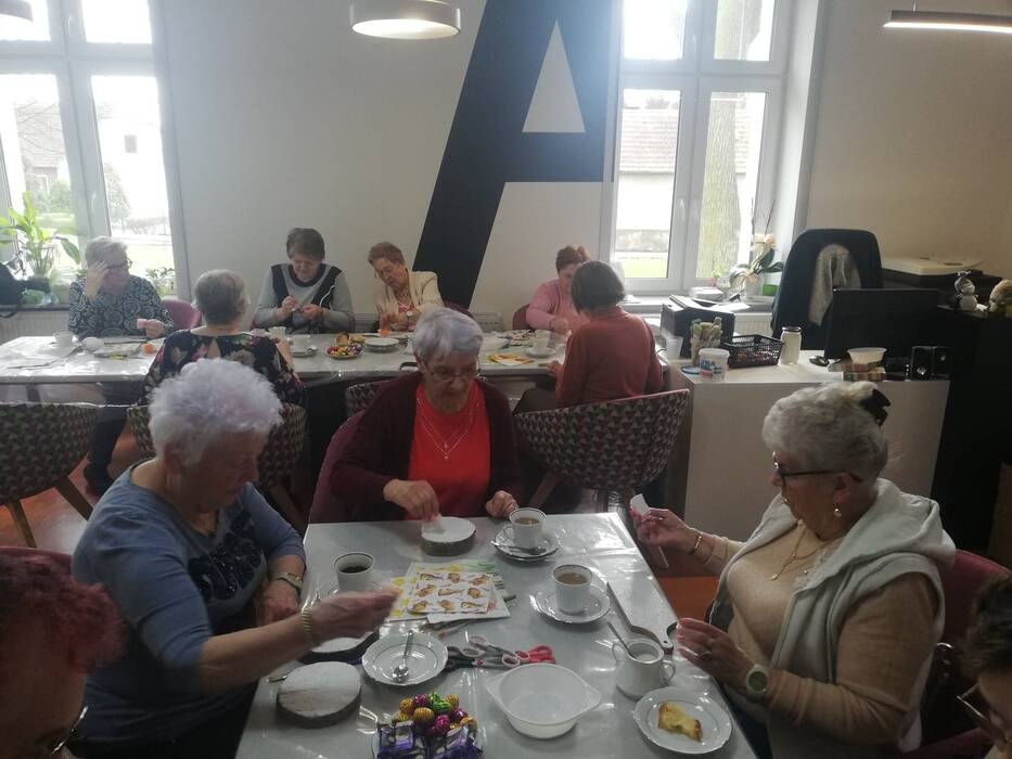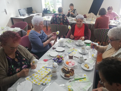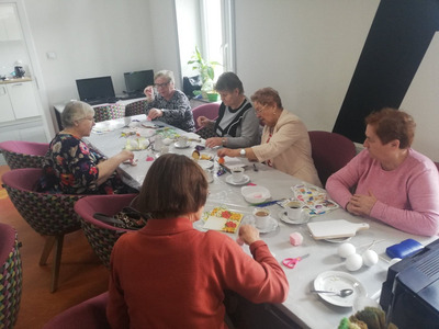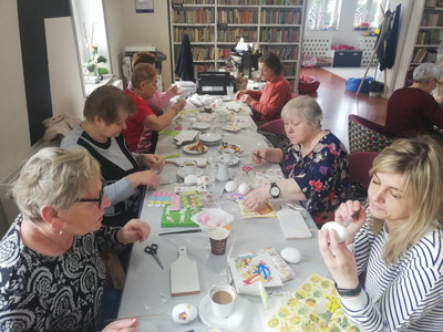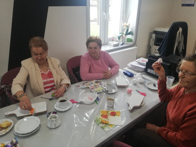 Podczas dzisiejszych zajęć seniorki z Klubu Seniora Tęcza ozdabiały styropianowe jajka metodą decoupage. Przygotowały również deseczki, które będą dekorować na następnych zajęciach, w maju.