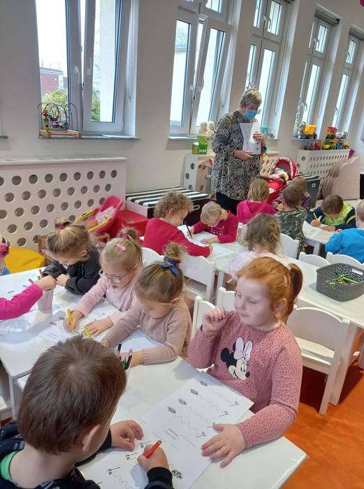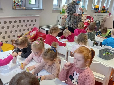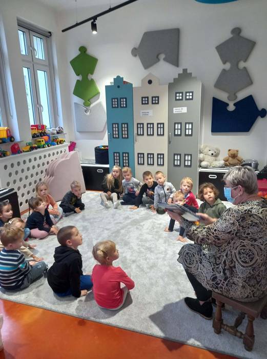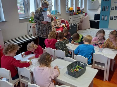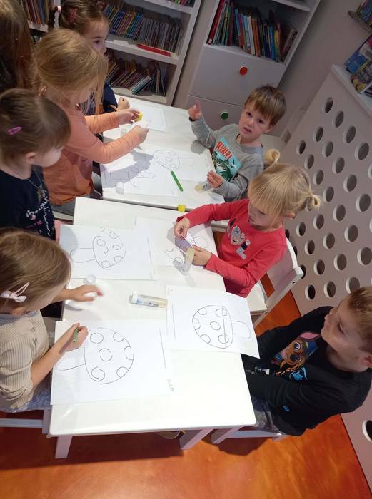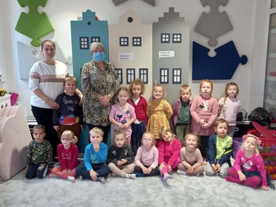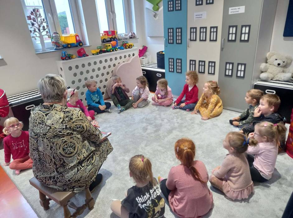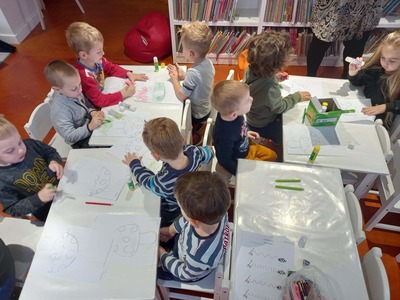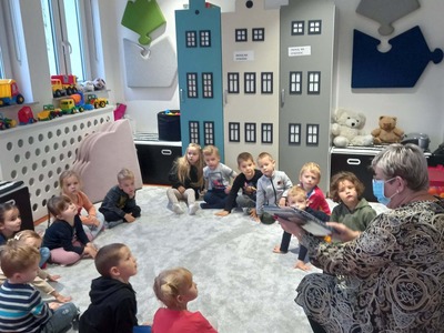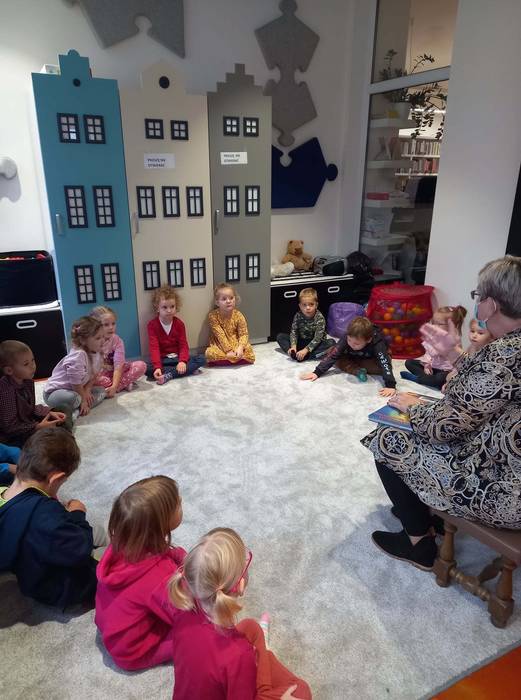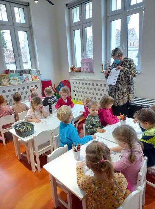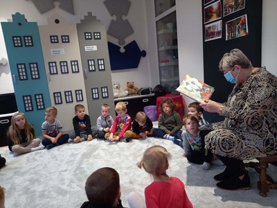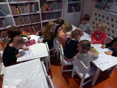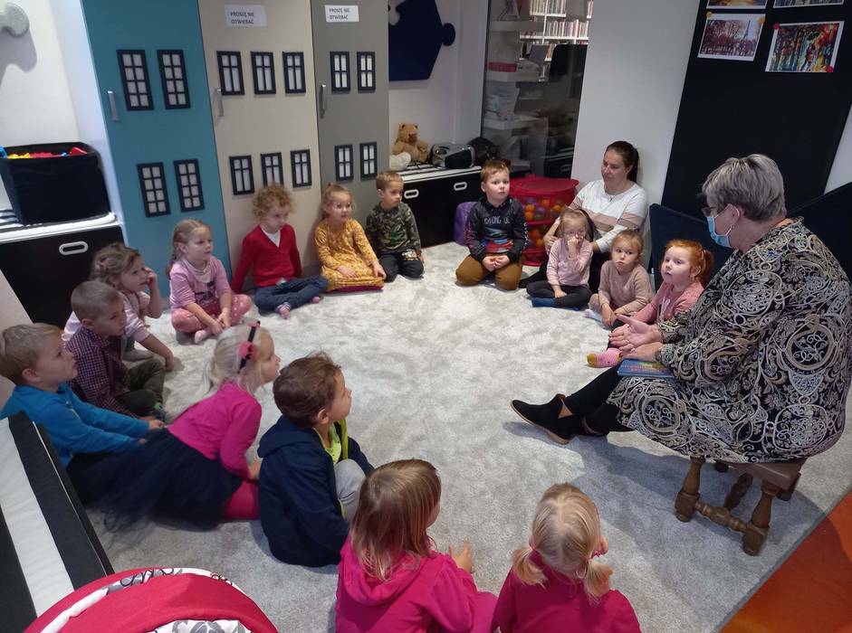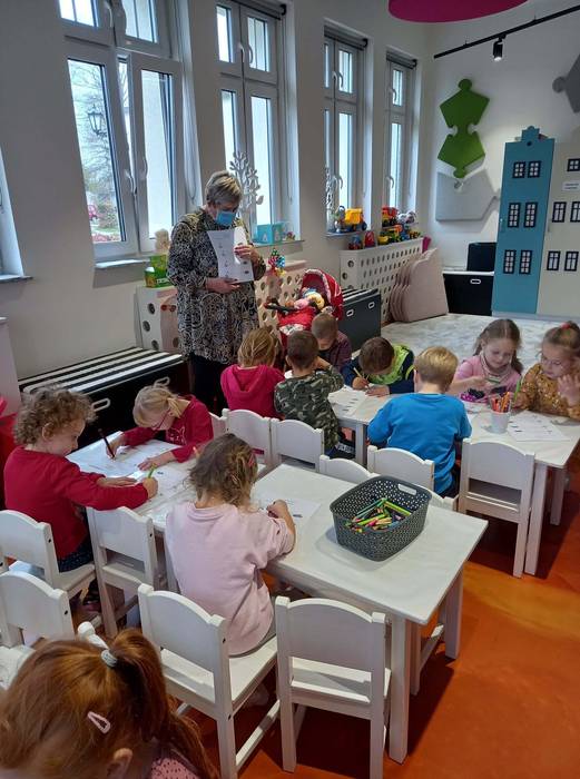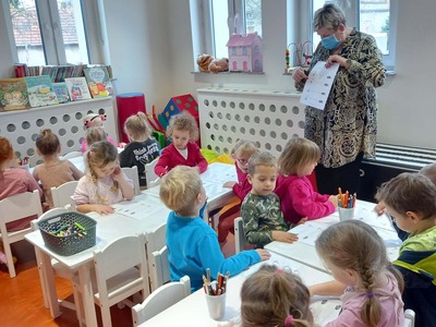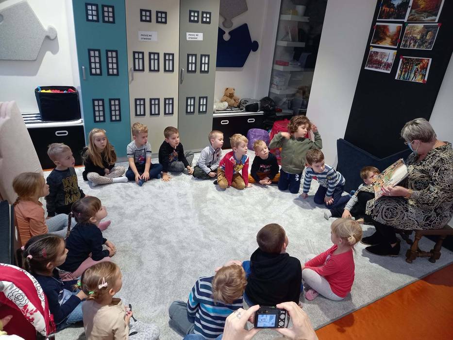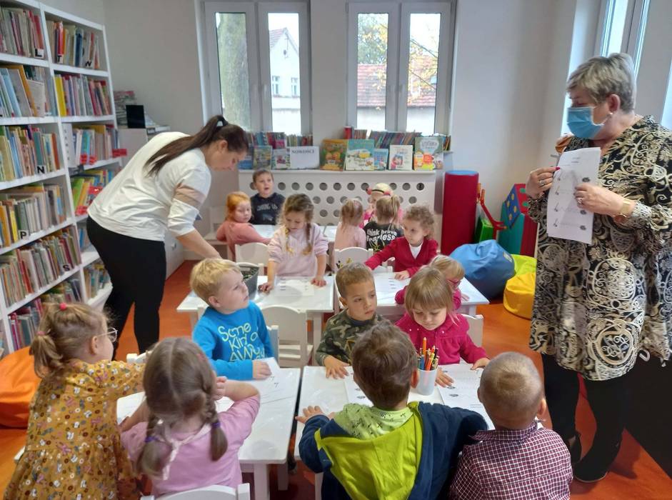 Warsztaty biblioteczne dla przedszkolaków - 8.11.2021 08 listopada 2021 Dzisiaj bibliotekę odwiedziły przedszkolaki z grupy Zajączków i Jeżyków. Dzieci uczestniczyły w zajęciach dotyczących różnych ujęć jesieni.